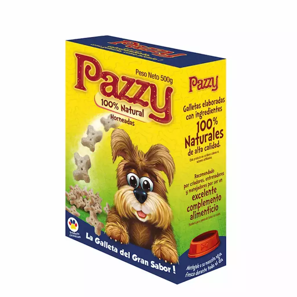 Las galletas para perros Pazzy son galletas 100% naturales y son galletas horneadas, sabrosas y crocantes. Su fórmula es adecuada para el consumo de perros de todas las razas. Estas galletas son un suplemento alimenticio recomendado por expertos.