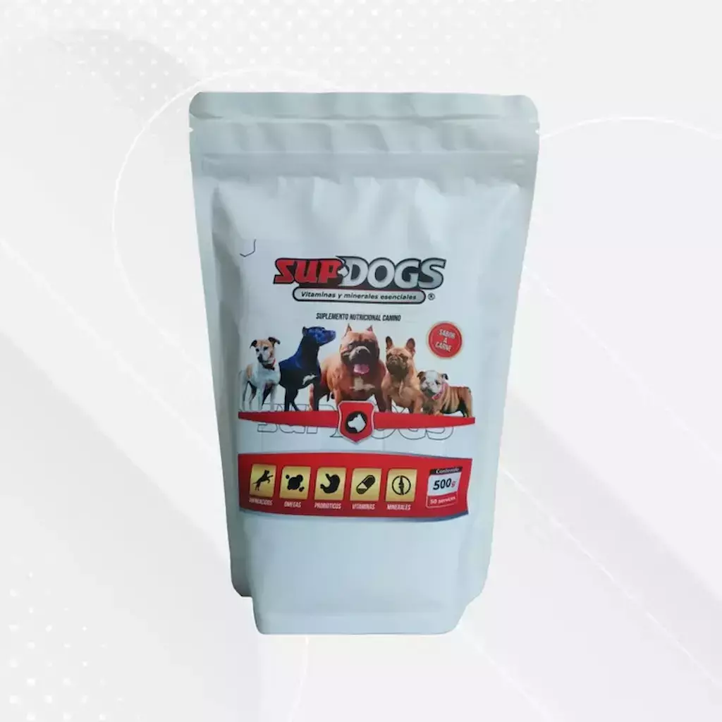 El Suplemento Nutricional Supdogs es una fórmula integral que combina 25 nutrientes esenciales, incluyendo vitaminas, minerales, antioxidantes, probióticos, aminoácidos, glucosamina y otros oligoelementos, diseñada específicamente para apoyar la salud y el bienestar de tu perro.